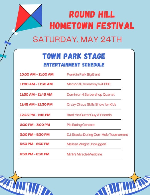 The 21st Annual Round Hill Hometown Festival is FOUR WEEKS away — on Saturday, May 24! We are looking forward to the Best Day of the Year in Round Hill and hope you will join us for: